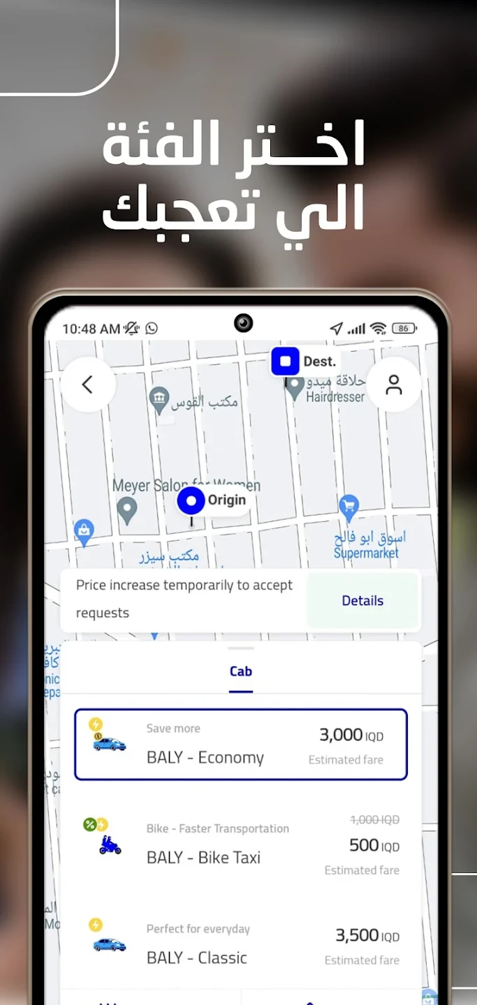 - Ride Booking: Baly | Order Taxi and Food lets you instantly request rides from various nearby taxi providers. This feature saves time by eliminating phone calls or waiting at the curb, getting you to your destination faster and more reliably, especially useful during busy commutes.