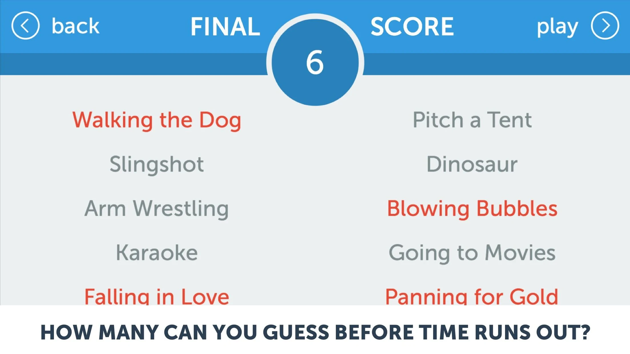 - Synchronize actions with the music to create memorable, guessing-friendly performances.