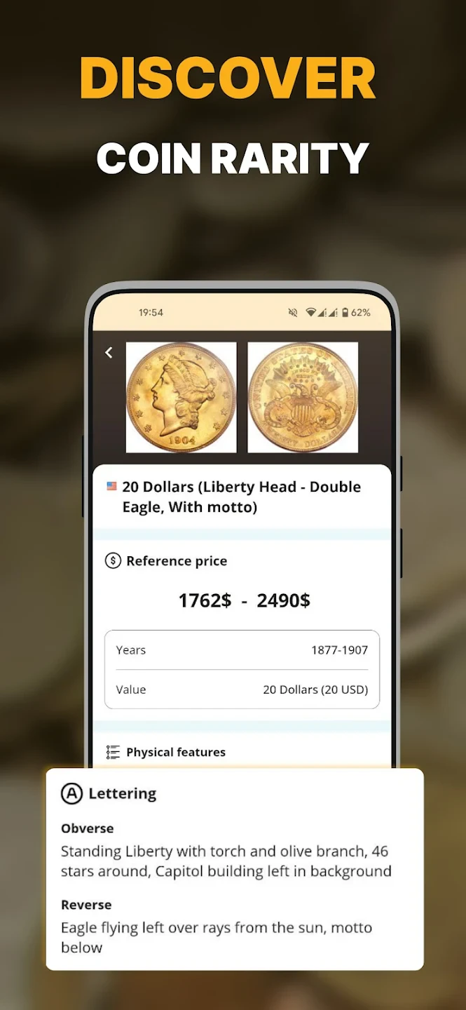 • Detailed Database Lookup: Access a vast repository containing thousands of coins from around the globe with specific details like country, year, mint, metal composition, face value, diameter, edge inscription, and both collector value and bullion/market price. This ensures precise identification and valuation accuracy, crucial for serious collectors or those evaluating potential investments.