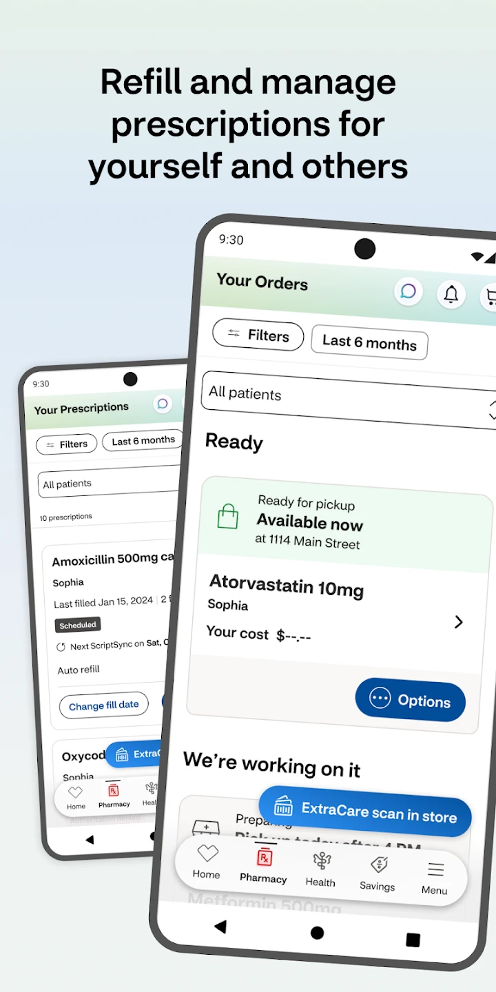 This application provides refill ordering, prescription price checks, and store locator features comparable to the CVS app. It includes loyalty program integration and digital coupon access. |