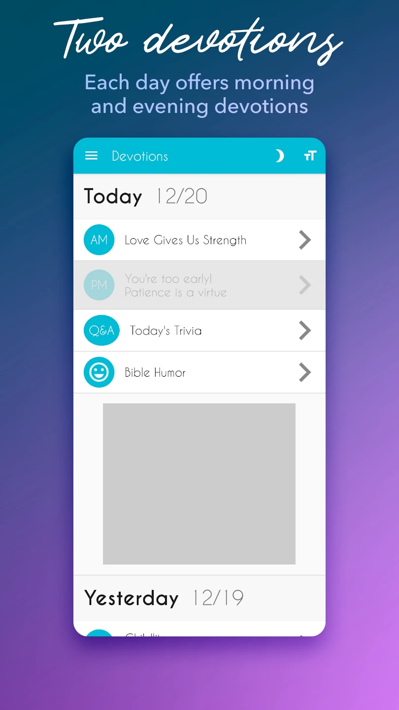 Designed for daily encouragement, it provides Bible verses and inspirational quotes with a focus on simplicity. Includes quick access to prayers and a community sharing feature. |