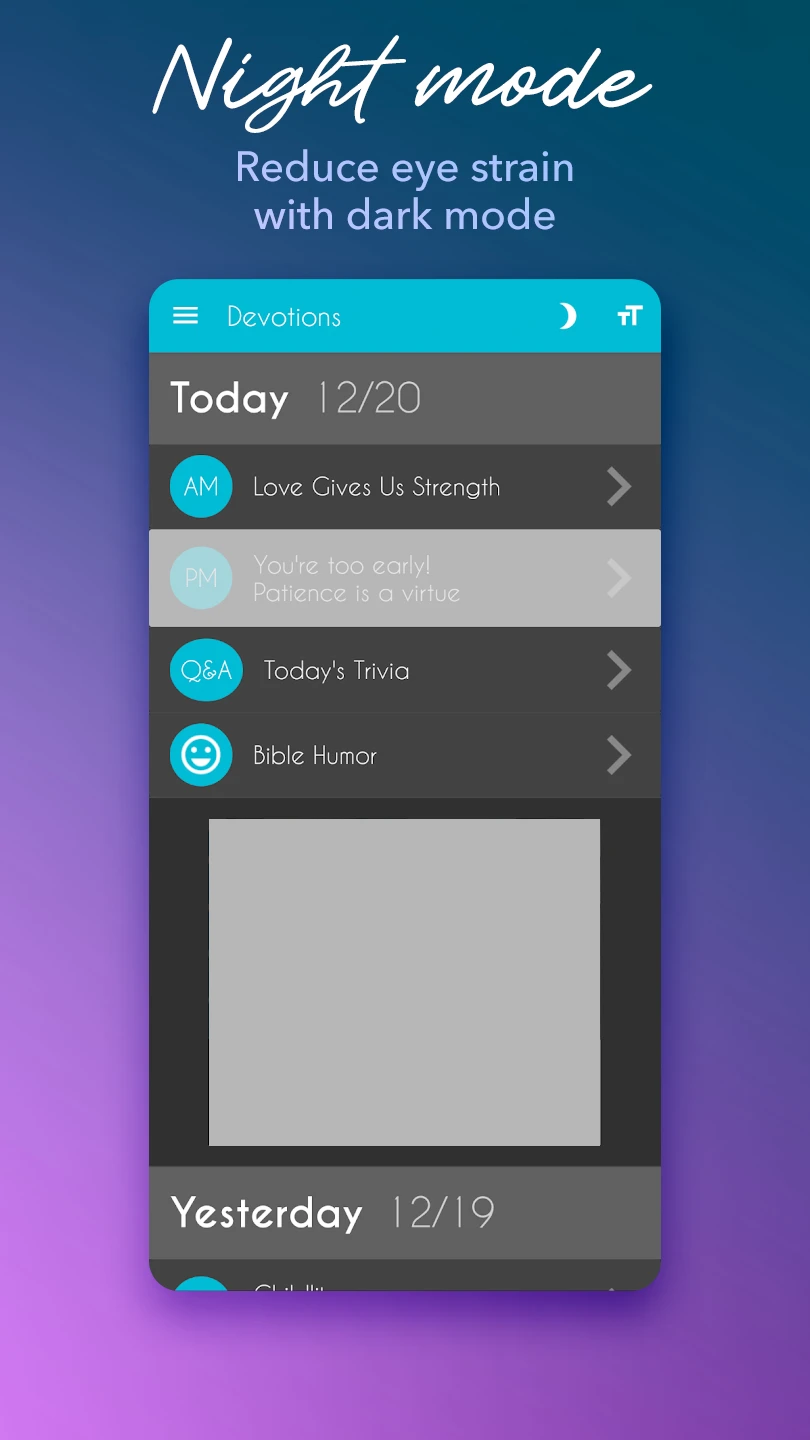 - Daily Reading Plan: Selects a random Bible verse each day, often with optional short reflections, helping users encounter God’s word regularly and unexpectedly, keeping the devotional content fresh and engaging without needing manual input.