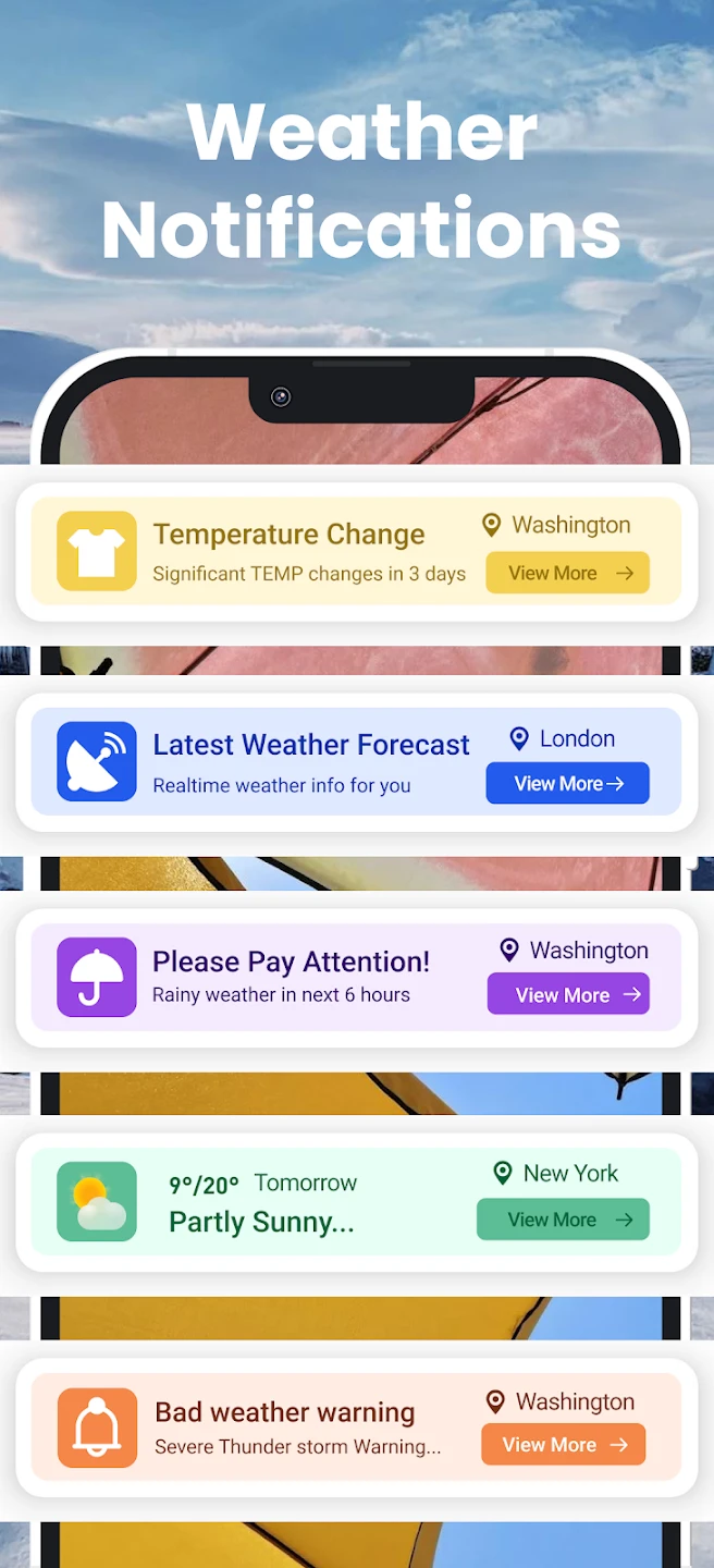 - Intelligent Severe Weather Alerts: Receives timely, targeted notifications for severe weather events specific to your location, including thunderstorm warnings, tornado threats, and flash flood alerts, prioritizing critical information to ensure immediate action if needed.