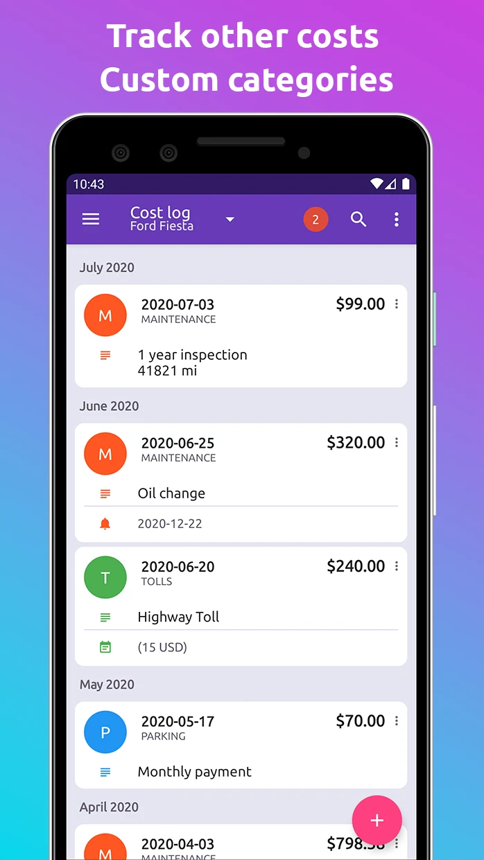 • Fuel Expense Log: Users can easily input details for each fill-up, including amount, cost, odometer reading, and gas station used, allowing for comprehensive analysis of fuel spending habits and vehicle efficiency over time.