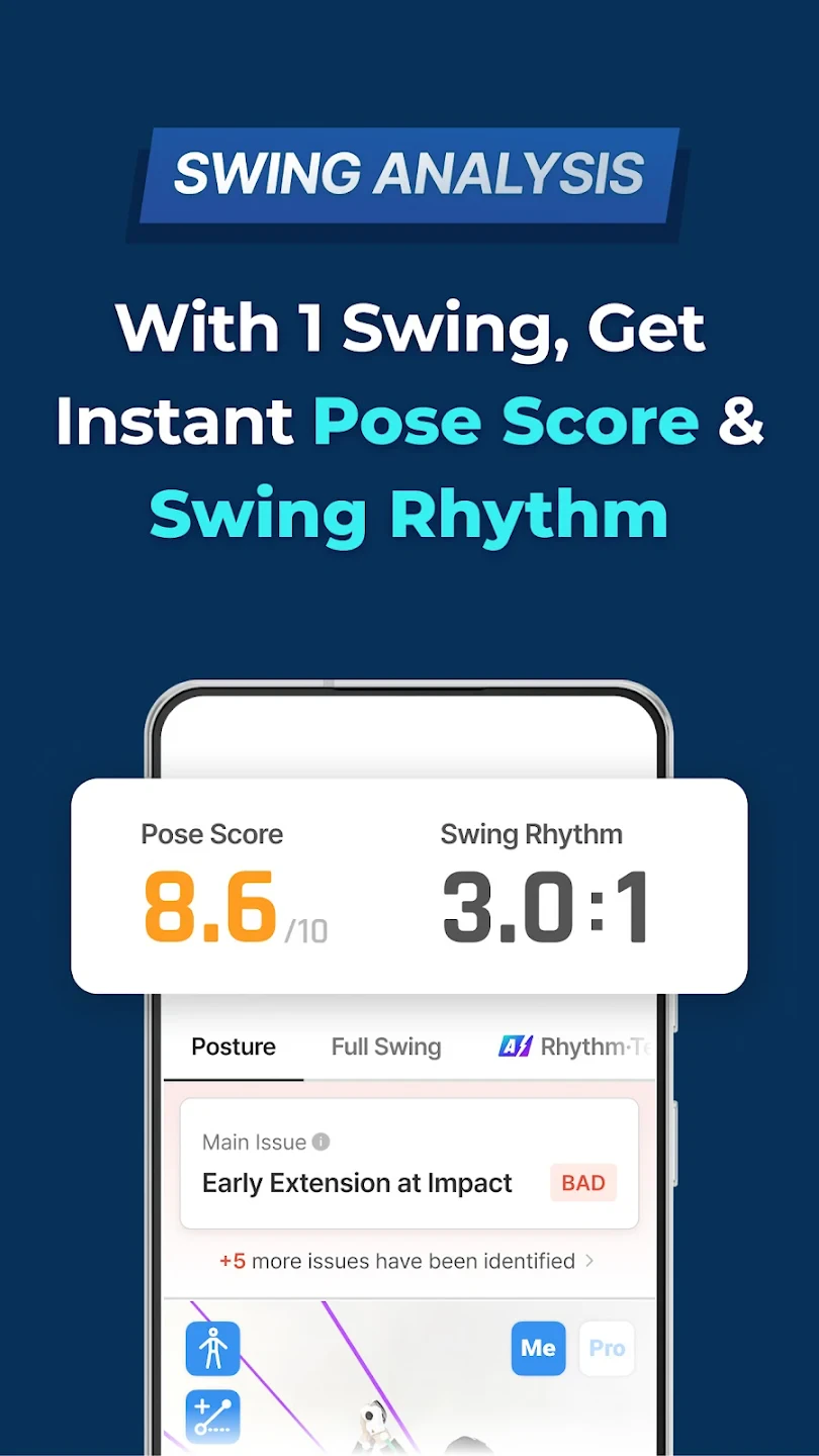 - Optional Video Recording & Overlay: Gear users with the ability to record their actual swing footage alongside the AI analysis, which places virtual overlays (like club path direction) on top of the video. This visual confirmation step turns the app into a powerful distance learning tool, letting you see the AI’s observations overlaid directly on your swing. Perfect for self-education or sharing precise swing data with coaches.