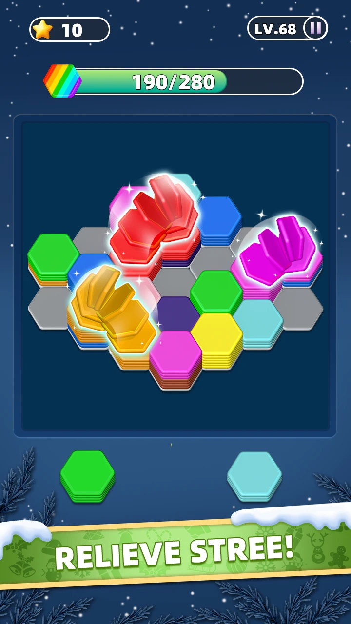 • Step 3: Tap matching colored hexagons to clear them or move them towards the target zone. Earn points for each successful match, chain reactions, and completing levels quickly. Progress through levels, unlocking new themes and challenges as your score increases.