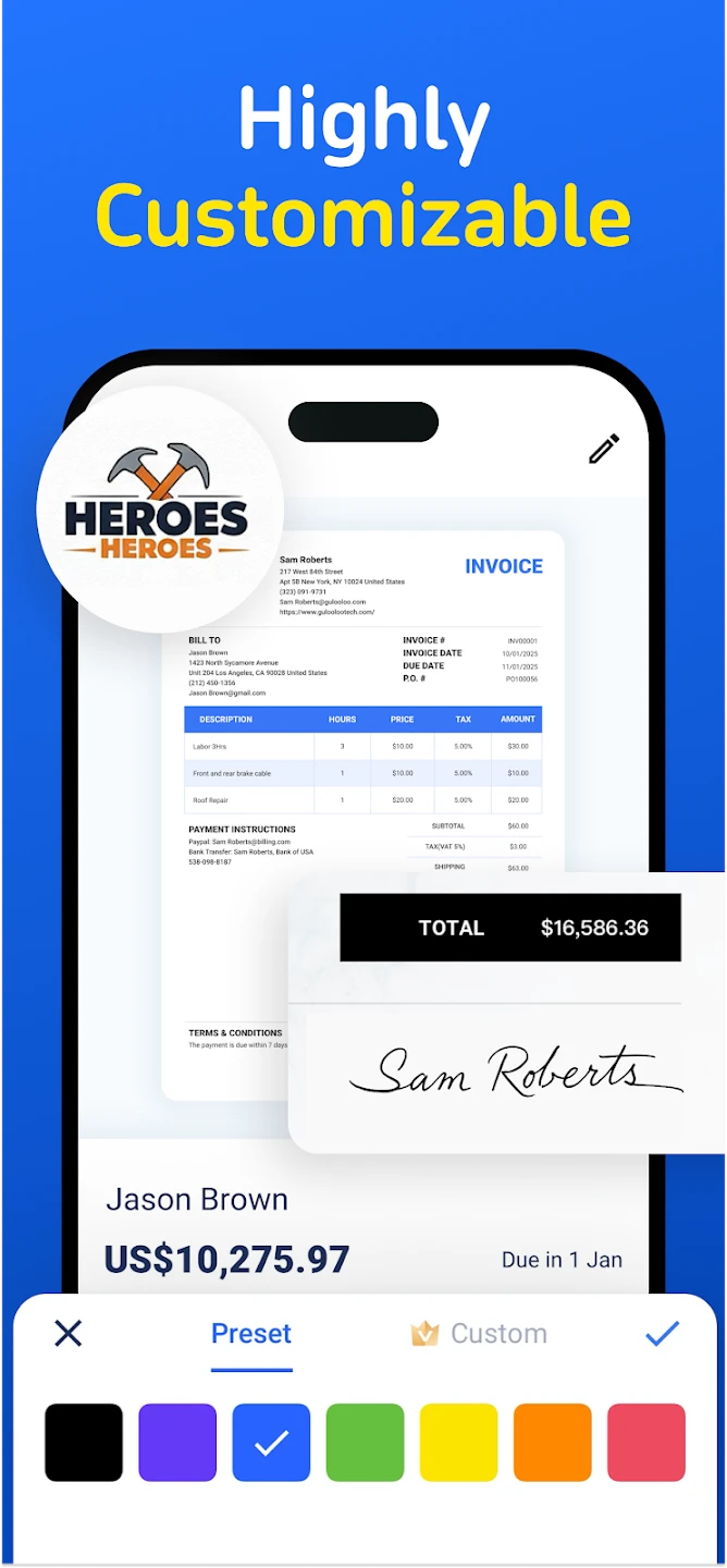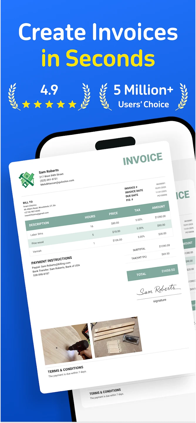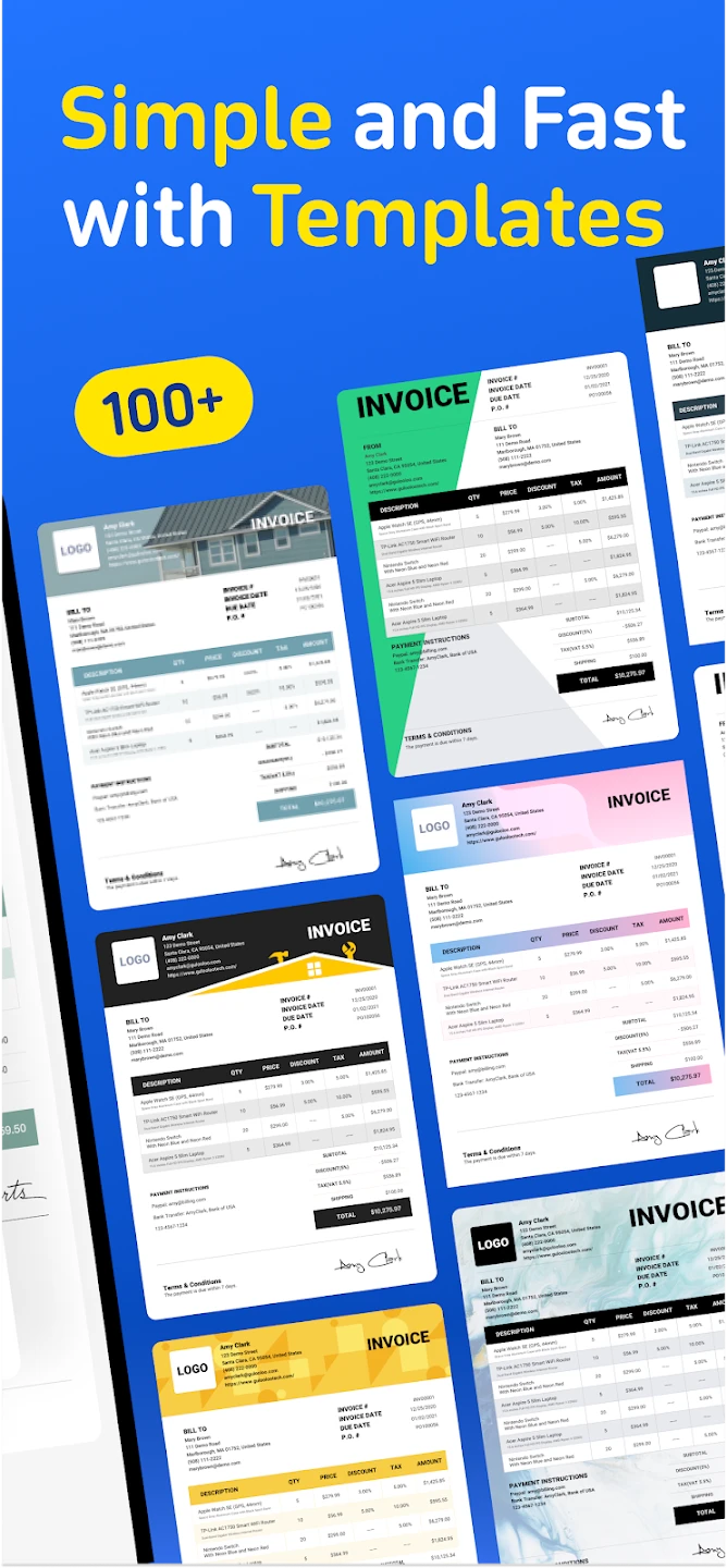 • PDF Export & Email Integration: Easily export invoices and estimates as high-quality PDF documents ready for printing, emailing directly to clients, or sharing via other digital platforms, ensuring documents are sent promptly and look perfect on all devices.