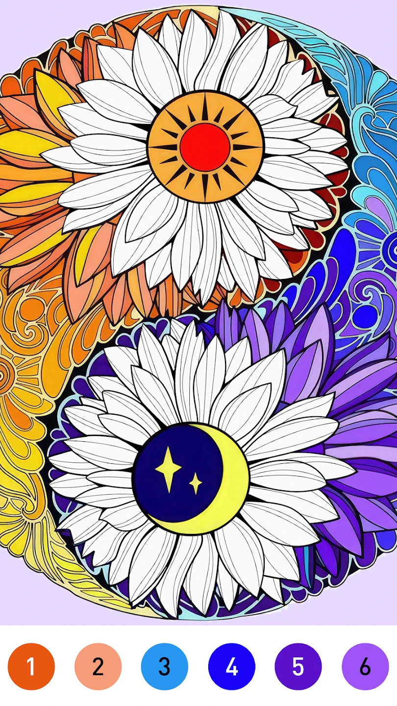 • Visuals or Art Style: The game features highly detailed, symmetrical mandalas with soothing color schemes. Each design boasts thousands of individual sections requiring coloring, presented in crisp, high-definition graphics that highlight intricate details and patterns.
