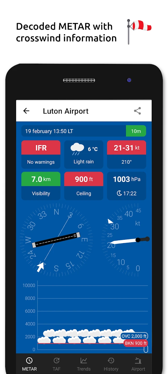 - Multi-Airport Comparison: View METAR/TAF data from multiple locations simultaneously with a split-screen feature, essential for planning diversions or understanding en-route weather variations. This advanced functionality supports operations in complex airspace where alternate airports might need evaluation based on current conditions.