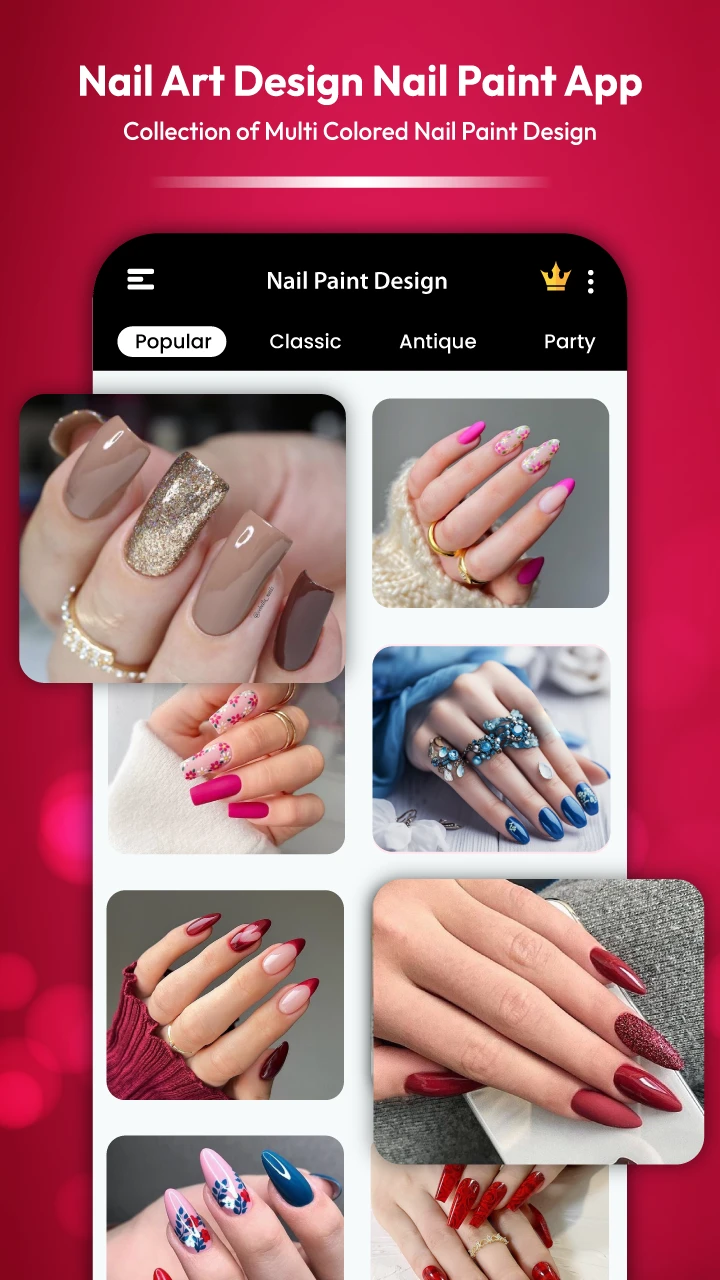 Nail Art Design : Nails Polish is a specialized application designed for enthusiasts and professionals involved in creating elaborate nail decorations. It simulates applying various polishes, glitter effects, and decorative stickers onto digital representations of finger and toe nails, allowing users to visualize potential designs before committing to physical application. Essentially, it serves as a virtual sandbox for exploring imaginative nail art techniques, particularly suited for those who love experimenting with manicures.