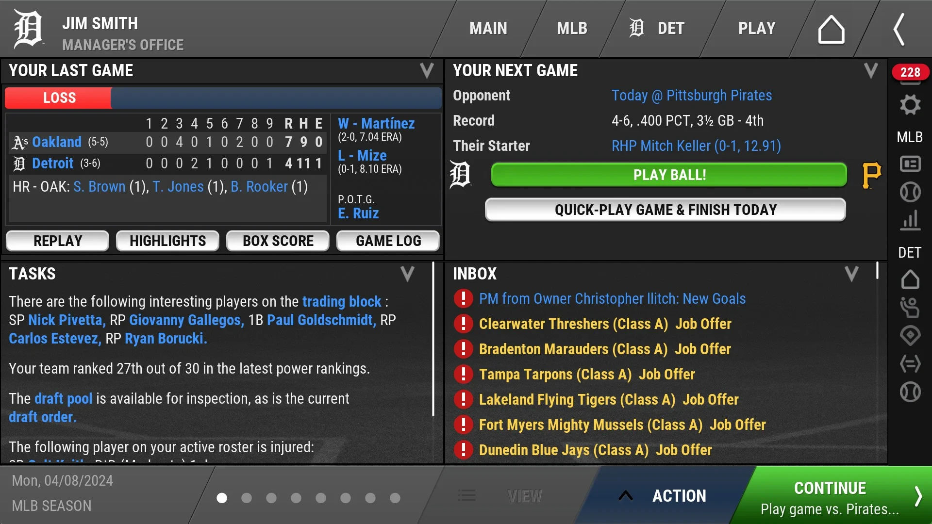 • [Core Gameplay Loop]: Players manage baseball teams through simulated seasons, making strategic decisions during games and between contests. The objective is to build a winning team by recruiting talent, training players, and outsmarting opponents through calculated choices during the gameplay.