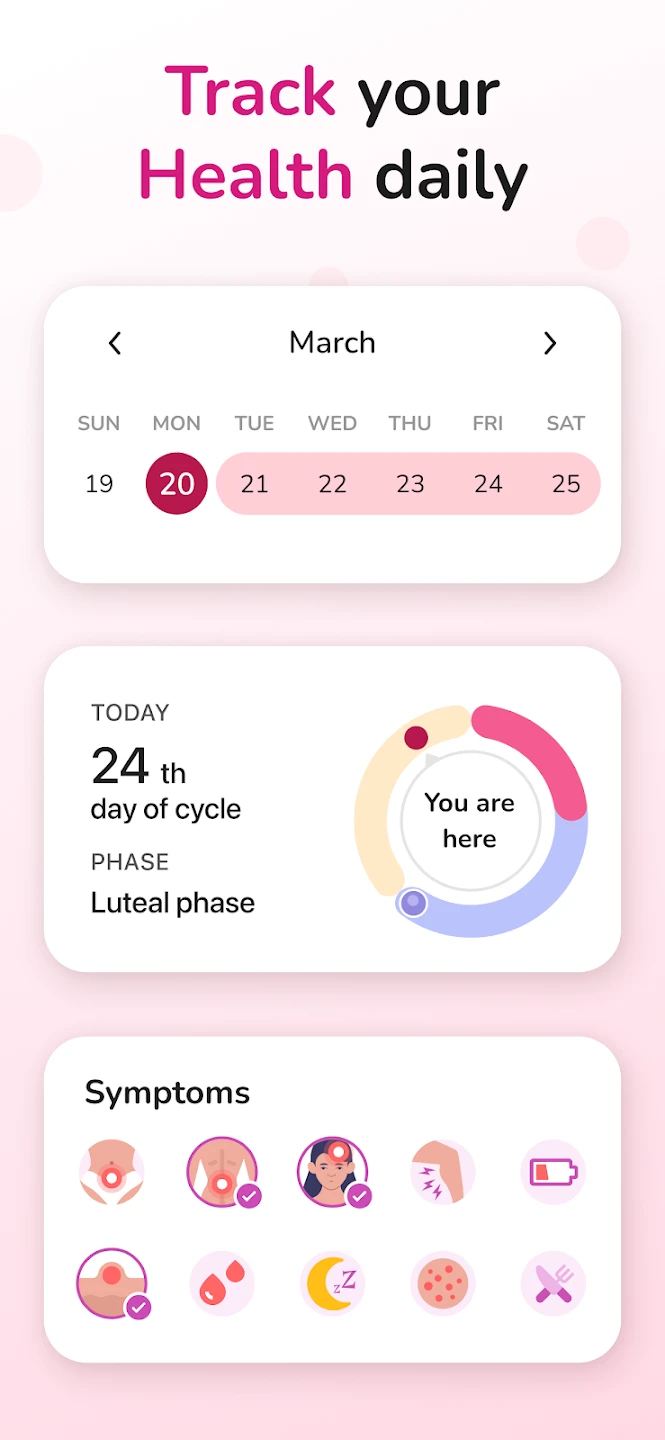 • Symptom & Mood Journaling: Allows users to log physical symptoms, emotional changes, and overall wellbeing throughout their cycle. The data visualizations help identify patterns between symptoms and specific phases, enabling proactive health management and better preparation for challenging times. For example, users can discover if certain foods affect their cycle or if specific exercises reduce cramping.