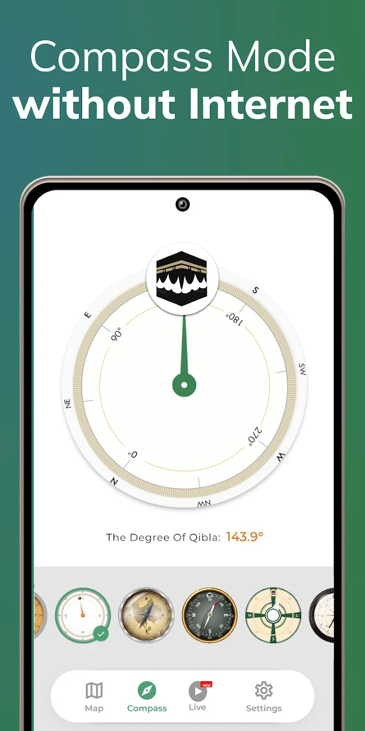 • Built-in Digital Compass: A highly sensitive electronic compass within your device accurately detects magnetic north (and corrects for it). The **Qibla Finder Compass 100%** displays your heading, making it easy to align yourself precisely with the correct direction for prayer.
