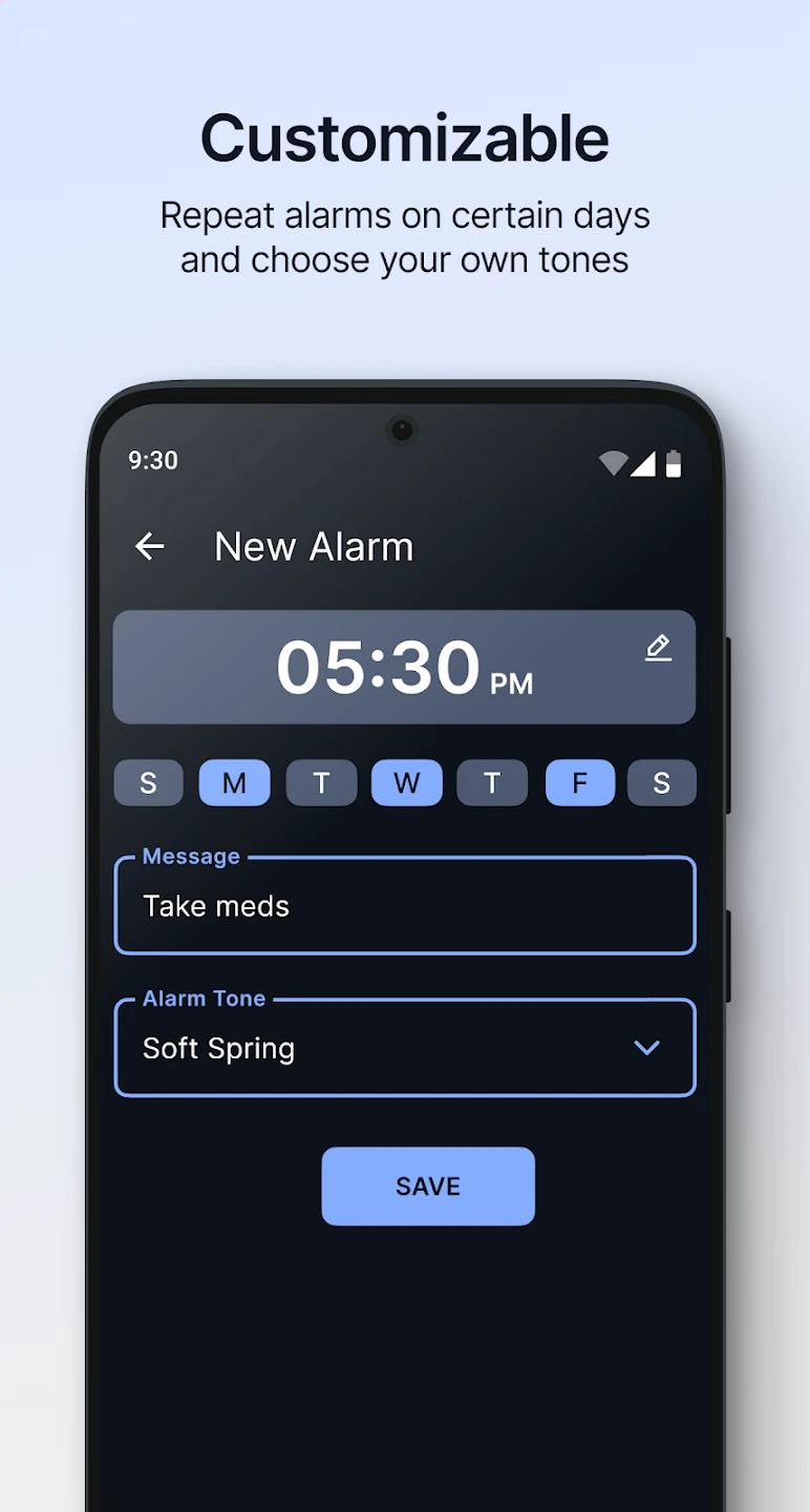 - Repeat Alarms: Define alarms that repeat daily from a start date to end date, or repeat on specific days of the week. This feature is perfect for setting consistent medication reminders or recurring appointments without needing to reset manually each time.