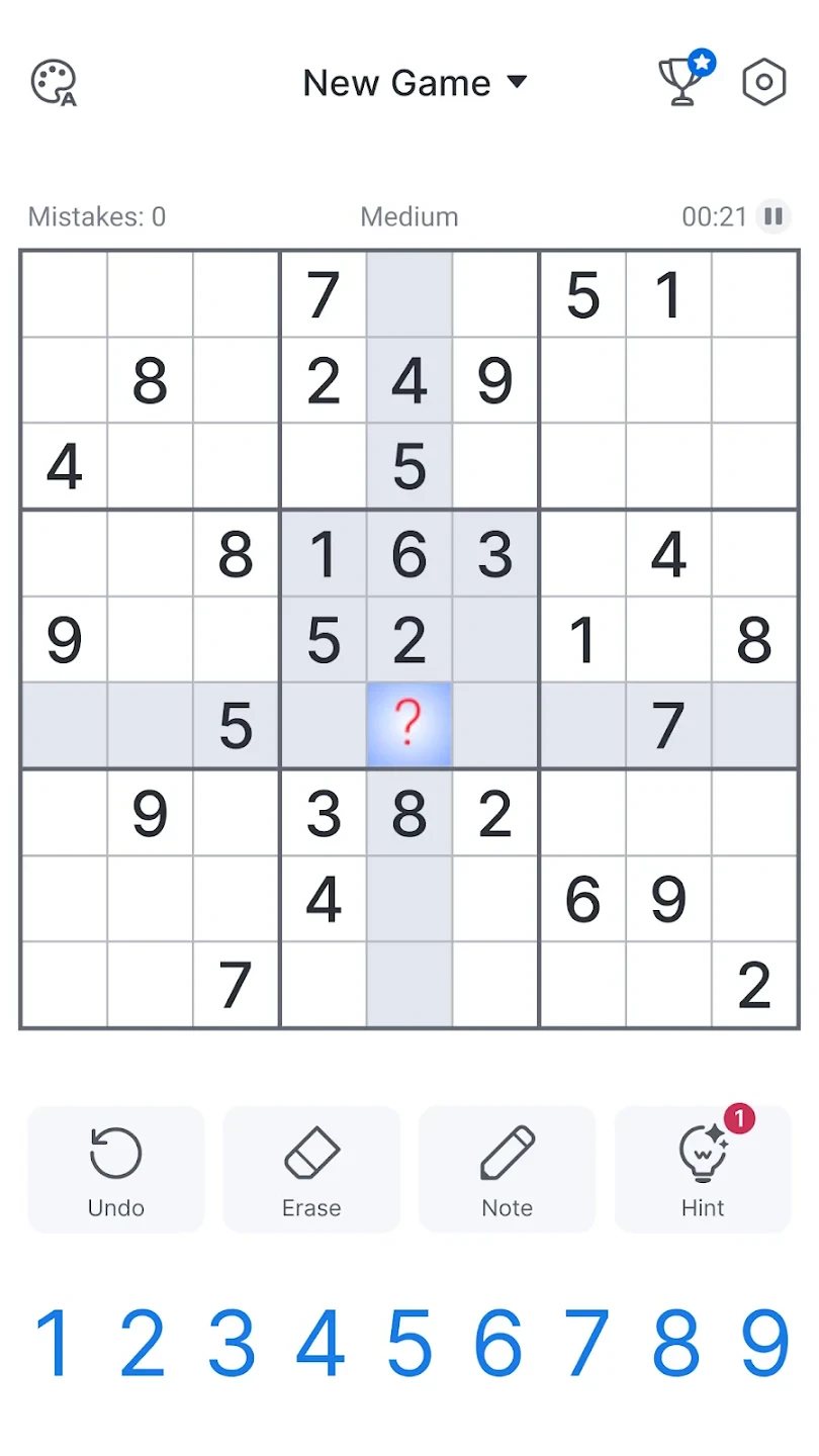 • Step 2: Click empty cells and enter numbers, using the number selection pad. The app highlights the entire column and 3×3 square to show where the number already appears.