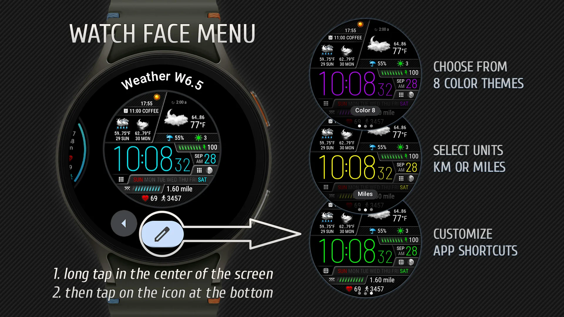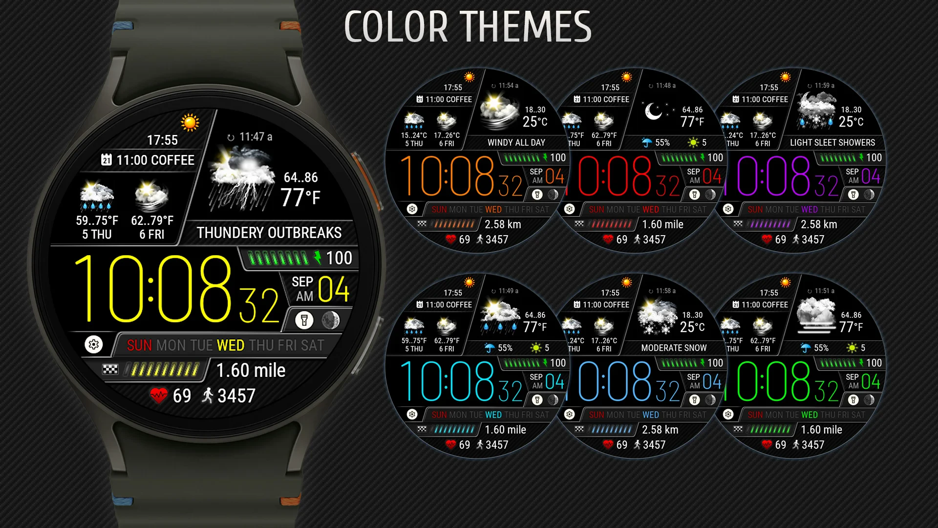 - Highly Customizable Display: Users can configure the layout to show exactly the weather information they need, including humidity, wind speed, pressure, sun/moon phase indicators, and even air quality data through intuitive on-screen controls. Smartwatch-specific settings also allow for different display styles, font sizes, and even different weather widgets for glanceable quick views, tailoring the face to individual needs and watch capabilities.