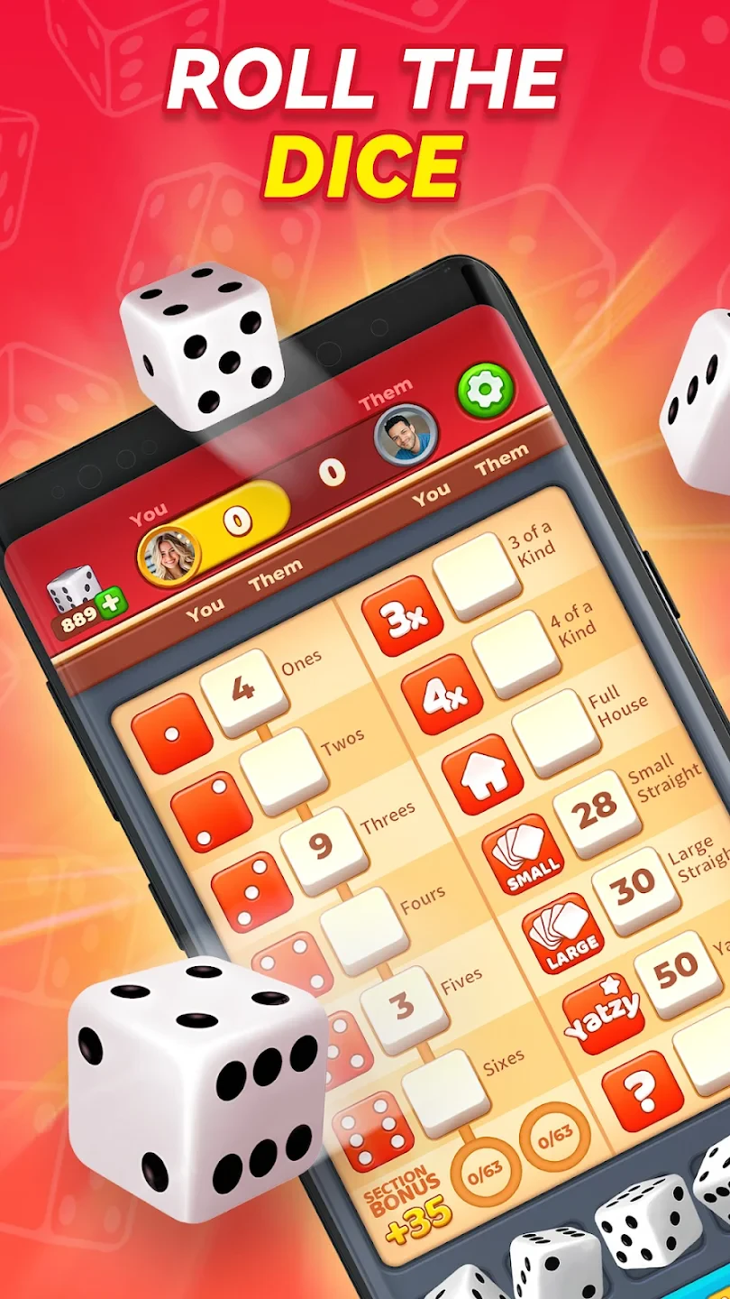 - [Core Gameplay Loop]: Roll five dice by tapping the screen and strategically decide which dice to re-roll to achieve scoring combinations like Three of a Kind, Full House, or Yahtzee itself. The objective is to maximize your score across multiple rounds before the game ends, using a scoring pad to track your points.